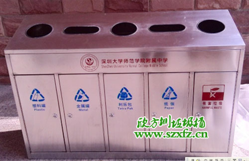 深圳師范學(xué)院附屬中學(xué)款式的C170五分類環(huán)?;厥障?/span>規(guī)格為:1600*400*860mm.外表是一款全新不銹鋼材質(zhì)打造而成.不銹鋼垃圾桶頂部有五個垃圾投放組合,圓形垃圾投口分別左,右,中間,還有兩個半圓在中間部位。不銹鋼垃圾桶正面開有五個門,每一個門前都有一個小鑰匙配套開門。正面中間橫幅有LOGO的標(biāo)準(zhǔn),還有深圳大學(xué)師范學(xué)院附屬中學(xué)字樣及英文拼音字母組合而成。不銹鋼垃圾桶五個取放垃圾內(nèi)膽正門,絲印有五個垃圾投放標(biāo)志。從左到右依次回收塑料罐,金屬罐,利樂包,紙張,有害垃圾及標(biāo)志。不銹鋼垃圾桶外觀為方形,具有獨(dú)特的堅(jiān)固耐用,不易破損;耐火安全,抗高低溫等優(yōu)勢。適合各大院校,高檔場所使用。