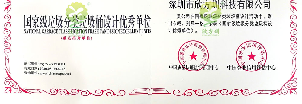欣方圳獲得國(guó)家級(jí)垃圾分類(lèi)垃圾桶設(shè)計(jì)優(yōu)秀單位,知識(shí)產(chǎn)權(quán)管理體系認(rèn)證,信息安全管理體系認(rèn)證,物聯(lián)網(wǎng)高新技術(shù)垃圾桶系統(tǒng)計(jì)算機(jī)軟件著作權(quán):基于物聯(lián)網(wǎng)技術(shù)的垃圾分類(lèi)處理設(shè)備控制系統(tǒng)軟件、遠(yuǎn)程監(jiān)測(cè)系統(tǒng)軟件、環(huán)境監(jiān)測(cè)系統(tǒng)、智能管理系統(tǒng)平臺(tái)軟件