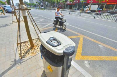 近日,街道馬路上出現(xiàn)新型垃圾桶,在頂蓋煙灰缸旁還有溫度表??吹搅诉@款“高大上”的垃圾桶。它除了頂部安裝帶指針的溫度表外,其他地方與普通垃圾箱無異。