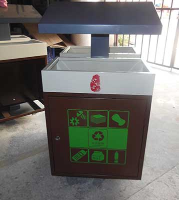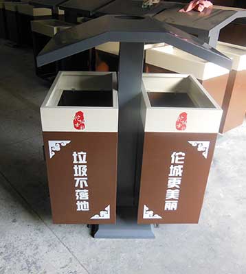 欣方圳鋼制戶外四分類垃圾桶產(chǎn)品一律用室外粉靜電噴塑,經(jīng)過180°的高溫使垃圾桶顏色持久不變,亮麗如新